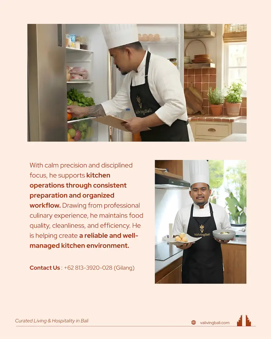 I Putu Agus Bayu Adnyana is a Valiving culinary professional known for his calm precision, strong kitchen discipline, and consistent food preparation standards. His structured approach supports smooth daily operations while maintaining quality, cleanliness, and efficiency in every service.