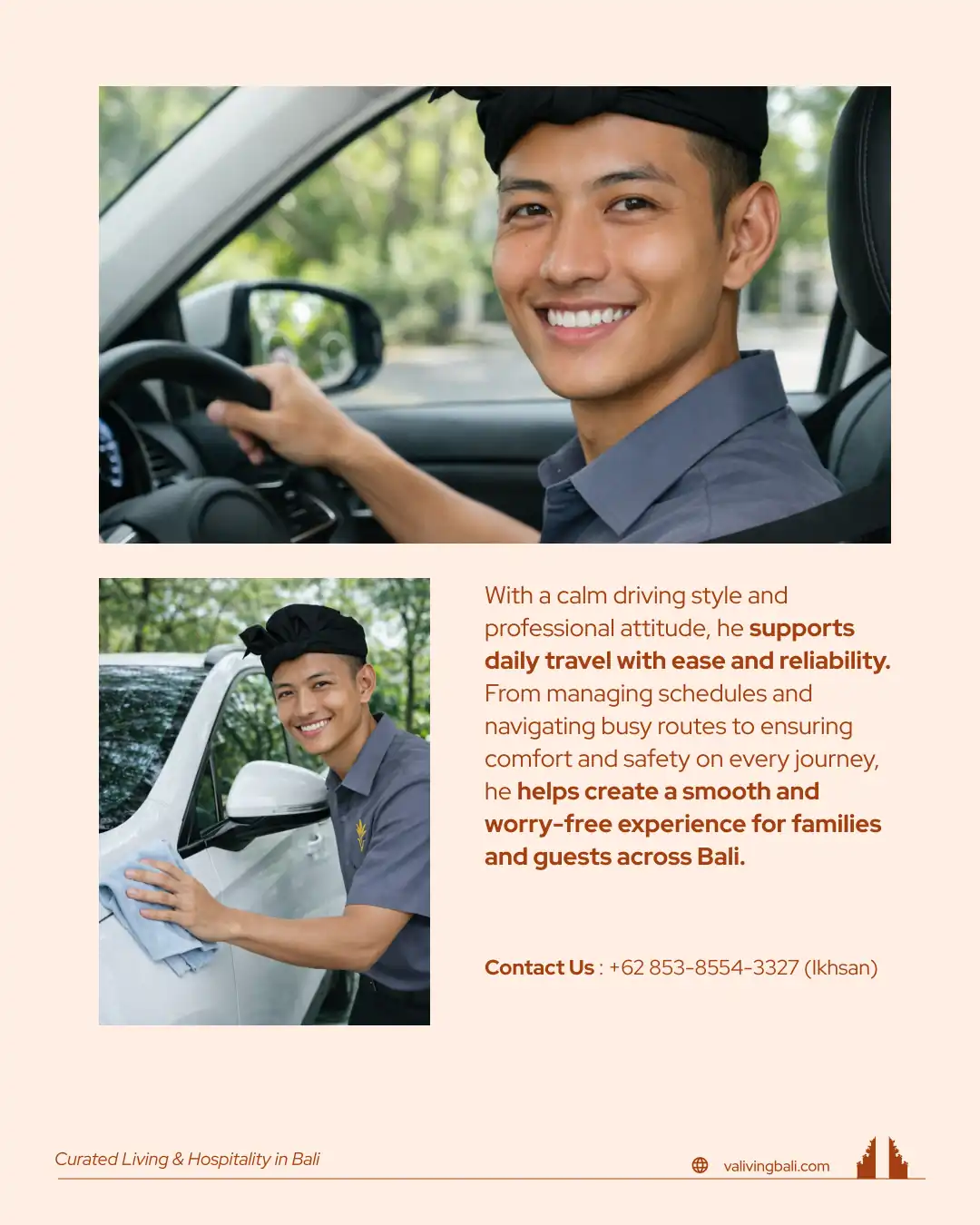 Khairil Anwar is an experienced private driver skilled in handling manual, automatic (matic), and electric vehicles. He maintains a safe, smooth, and client oriented driving style, with strong adaptability to Baliβs narrow roads and complex traffic conditions. He is flexible with shift schedules and committed to maintaining vehicle cleanliness and performance.